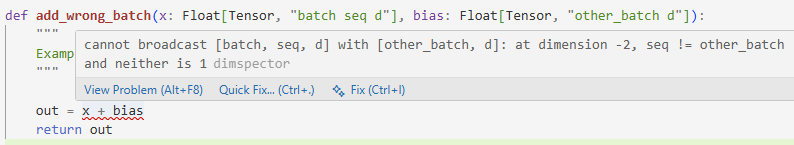 From these shape annotations, Dimspector can infer dimensional variables and shapes, which can (optionally) be used to provide inlay hints in your editor and to provide error diagnostics on shape mismatches: