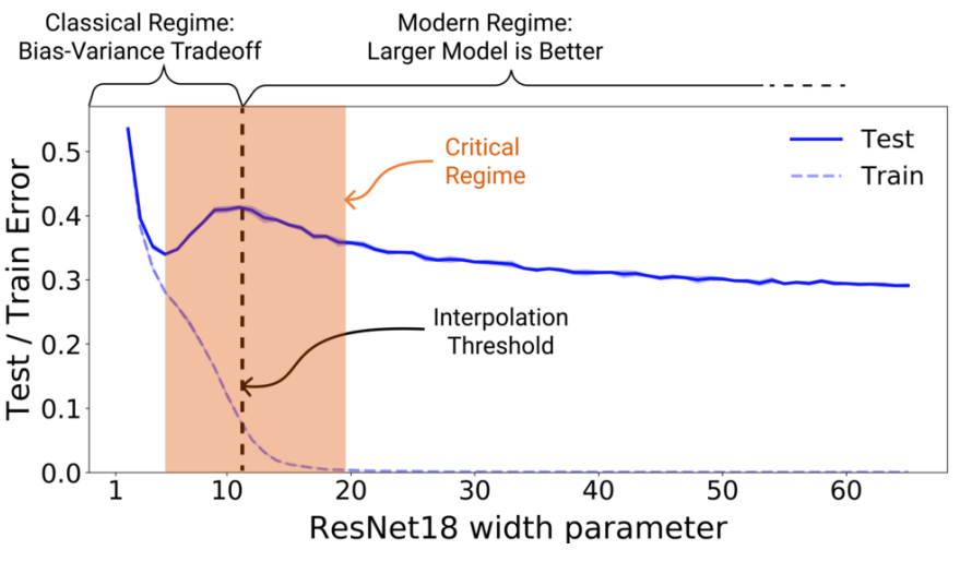 If you train a network of varying size on a task, and plot the train and test error against the model size, there's a fair amount of evidence you'll get a graph like the following (source):