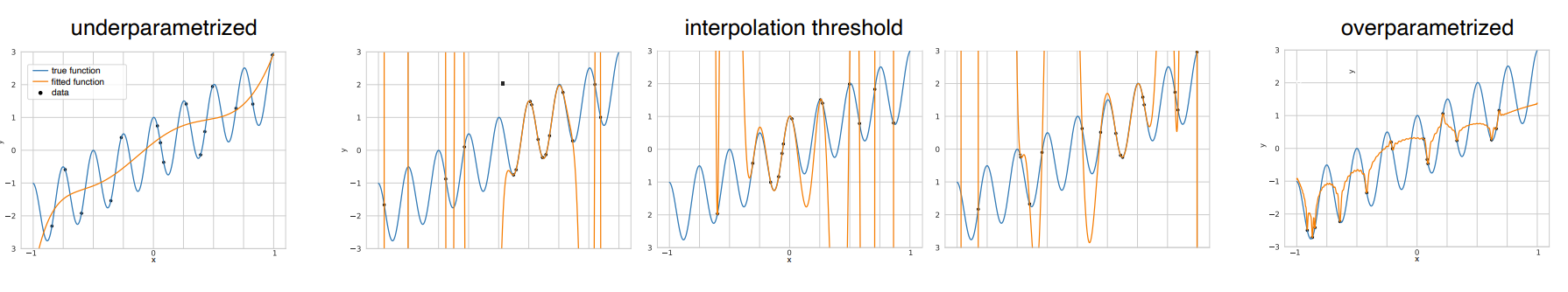 Note that near the interpolation threshold, we can fit a curve through every point, but need huge oscillatory swings to do so, whereas with more parameters we can still exactly fit the training set, but can choose a simpler curve to do so.